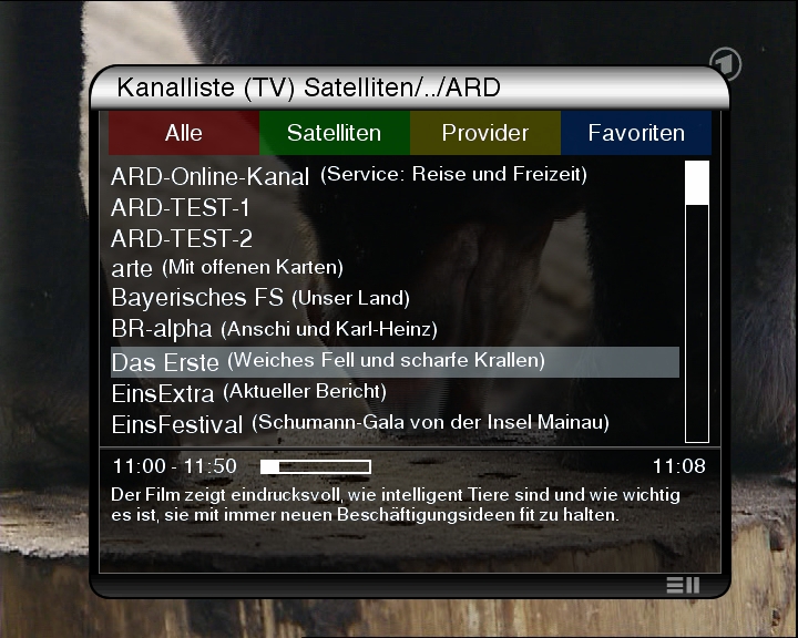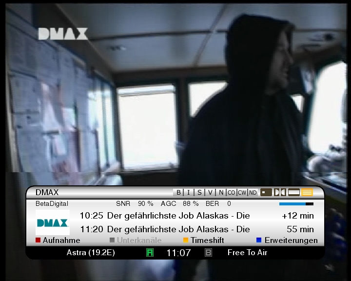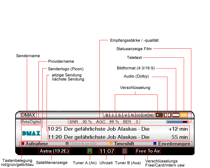 2 29. August 2007, 23:50 Genauere Infobarbezeichnung Was gibt es bei der Infoanzeige: SendernameProvidernameSenderlogo/Picon 1.)jetzige Sendung (Anfangsuhrzeit, Event ,erbleibende Zeit) 2.)nächste Sendung (Anfangsuhrzeit, Event , Filmlänge) 2.)Empfangsstärke und -qualität (SNR, AGC, BER)Status Filmanzeige wie weit der Film schon istTeletext Aus/AnBildformat 4:3(Aus)/16:9(An)Audioformat Aus/Dolby(An)Verschlüsslungsicons (B=Betacrypt/I=Irdeto/S=Seca/V=Viaccess/N=Nagra/CO=Conax/CW=Cryptoworks/ND=NDS) Verschlüsselungsanzeige Crypto Aus/AnSatelitenanzeige z.B. Astra (19.2E)Tuner A Aus/AnTuner B Aus/AnUhrzeitVerschlüsselungsanzeige FreeToAir/Card/Intern uswTastenbelegung rot/grün/gelb/blau rot=Aufnahme/grün=Unterkanäle/gelb=Timeshift/blau=Erweiterung/grau=inaktive Funktion [/list=1] 1.) Senderlogo wird nur angezeigt wenn Picon aktiviert und Bilder vorhanden sind 2.) Wenn kein EPG vom Sender vorhanden ist wird nix angezeigt Bilder infoscreen1.jpg 144,85 kB, 720×576, 1.389 mal angesehen mfg kayshadow