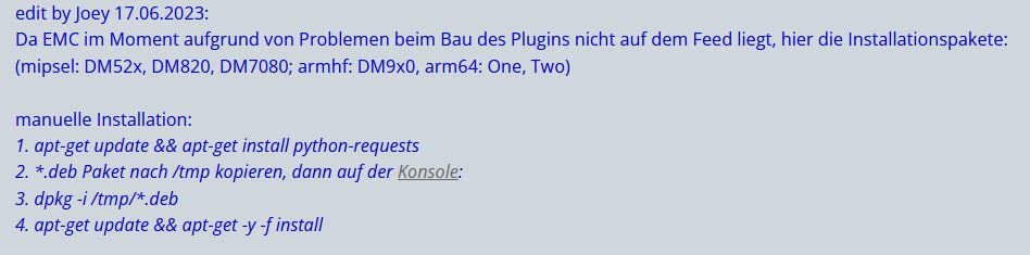 2) Der 2. Weg zum aktualisierten EMC wäre das Plugin "GitHubPluginUpdater", aber ich finde das im installierten Image OE2.6 nicht in der Software und auch die Suche hier im Forum hat kein gewünschtes Ergebnis gebracht. Was ist zu tun, damit ich in den Genuss des Plugins komme? Mit dem Install eines Files würde ich wohl zurecht kommen, hab nur Bedenken, weil ich eben keine falsche Version über mein OE2.6 bügeln will.