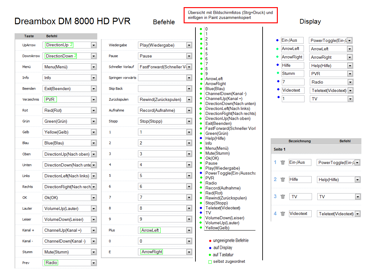 - Die jetzt erscheinende Befehlstabelle genauso in unsere 1. Paint-Datei einfügen und zusammenfügen. Nun sehen wir alle Befehle im Überblick. Das ist auch hilfreich, falls ich die Belegung von ähnlichen Geräten vergleichen möchte z.B. DM 800 / DM 8000. (Beispiel im Anhang)