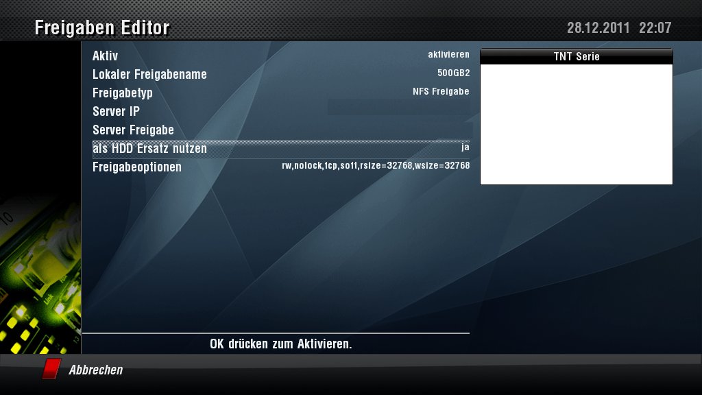 Ich bin seit kurz vor Weihnachten stolzer Besitzer einer DM7020HD und eines Synology DS212+ NAS mit einer HDD. Ich bin total neu hier und hab das komplette Forum schon die letzten Tage durchforstet. Leider hab ich keinen Beitrag gefunden, der mir geholfen hat auf das NAS aufzunehmen bzw eine auf dem NAS in dem Ordner movie liegen ts-Datei mit Hilfe der Dreambox zu finden und wiederzugeben. Ich hab mir eine externe USB HDD geliehen. Auf diese kann ich aufnehmen und auch wiedergeben. Auf der Dreambox befindet sich das aktuelle Newnigma2 Image im Urzustand.