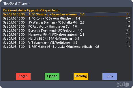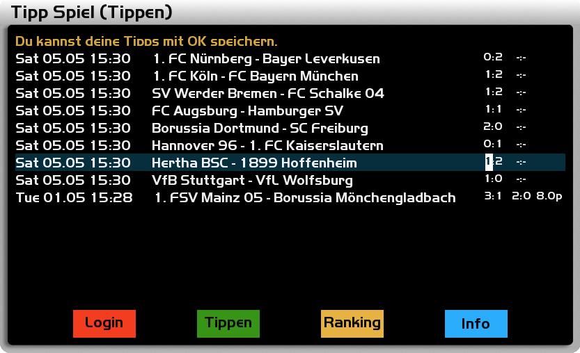 EDIT: Ich habe hier jetzt noch etwas rumgespielt: Kann es sein, daß das Plugin nur mit HD-Skins läuft? Und noch eine Anregung (die wahrscheinlich eh schon auf der ToDo-Liste hast): wäre es möglich, daß man auch schon die Spiele des/der nächsten Spieltage(s) sieht, damit man auch eine Woche im Voraus tippen kann?