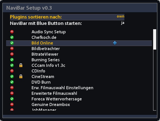 wenn ihr dann im Menu den INFO Button drückt wird das plugin makiert und ihr könnt wieder mit INFO das plugin platzieren.