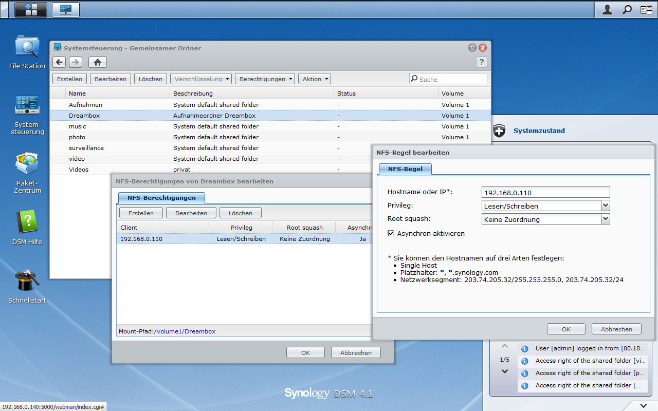 Aber suche mal in den Netzwerkdiensten nach NFS, das muß aktiviert werden und dann suchst du in den Freigabeordnern, wo du NFS mit den gewünschten Rechten freigeben kannst.
