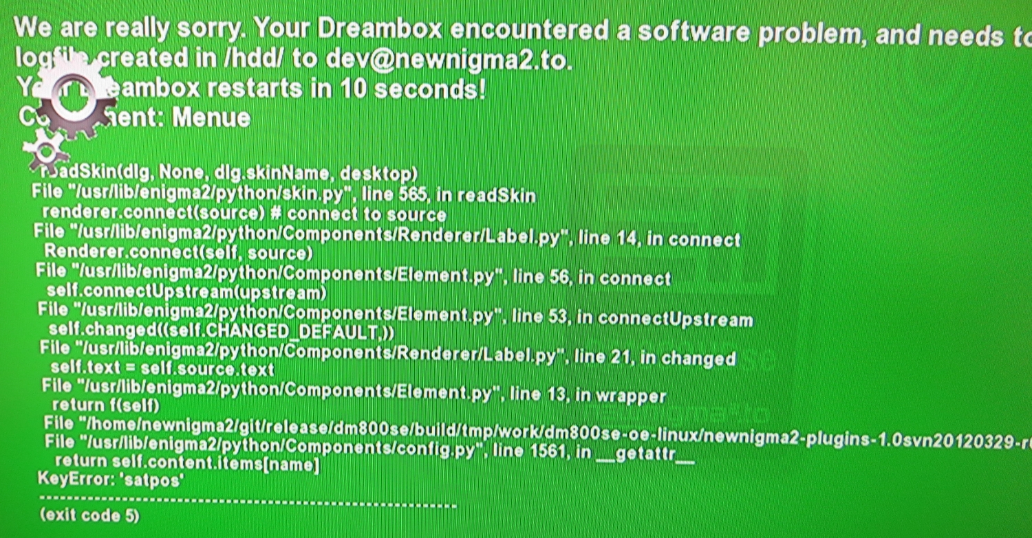 ich habe eine DM800SE, die mir seit geraumer Zeit Probleme macht. Anfangs war es ein Green-Screen und ich habe hier im Forum nach diesem Problem gesucht. Gefunden habe ich den Hinweis, dass der Flash-Speicher voll ist. Ich habe dann ein neues Image aufgespielt, die Box ist hochgefahren.