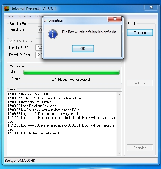 Mit der Option "recover bad sectors" flashen geht auch ohne DreamUp, wenn man die Funktion im BIOS der Dream aktiviert (Dream in Stop-Modus bringen, dann per Telnet verbinden und unter Misc > Flash Sector Recovery > "Enabled" (per+/- Taste) einstellen) und danach ganz normal über einen Browser flashen.