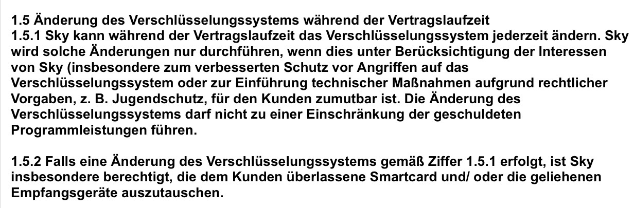 1.3.2 Sky leistet in der Weise Gewähr, dass das CI Plus-Modul geeignet ist, die Sendesignale von Sky zu entschlüsseln. Sky bietet keine Gewähr, dass die Sky Programminhalte über das CI Plus-Modul in Verbindung mit einem vom Abonnenten Kunden bereitgestellten CI Plus-Modul kompatiblen Endgerät (TV, Display etc.) vollständig empfangen oder vollumfänglich genutzt werden können. Soweit der Abonnent Kunde die Sky Programminhalte über das CI Plus-Modul von ihm bereitgestellte Endgerät nicht empfangen oder voll umfänglich nutzen kann, berechtigt ihn das nicht zu einer Kündigung des Abonnementvertrags