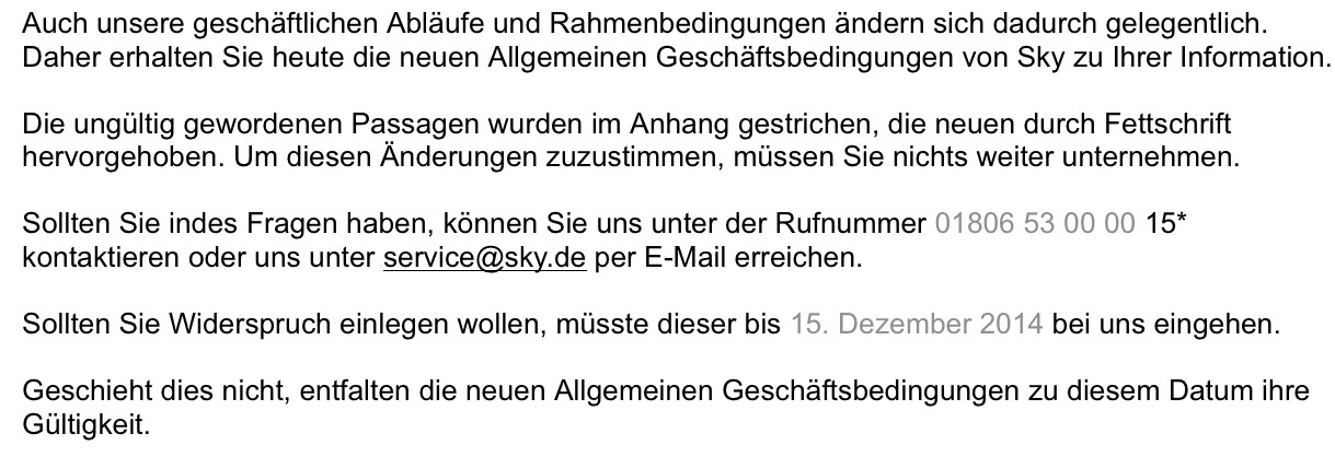 • Sky mit neuen AGB's, ab den 15. Dezember 2014 gültig