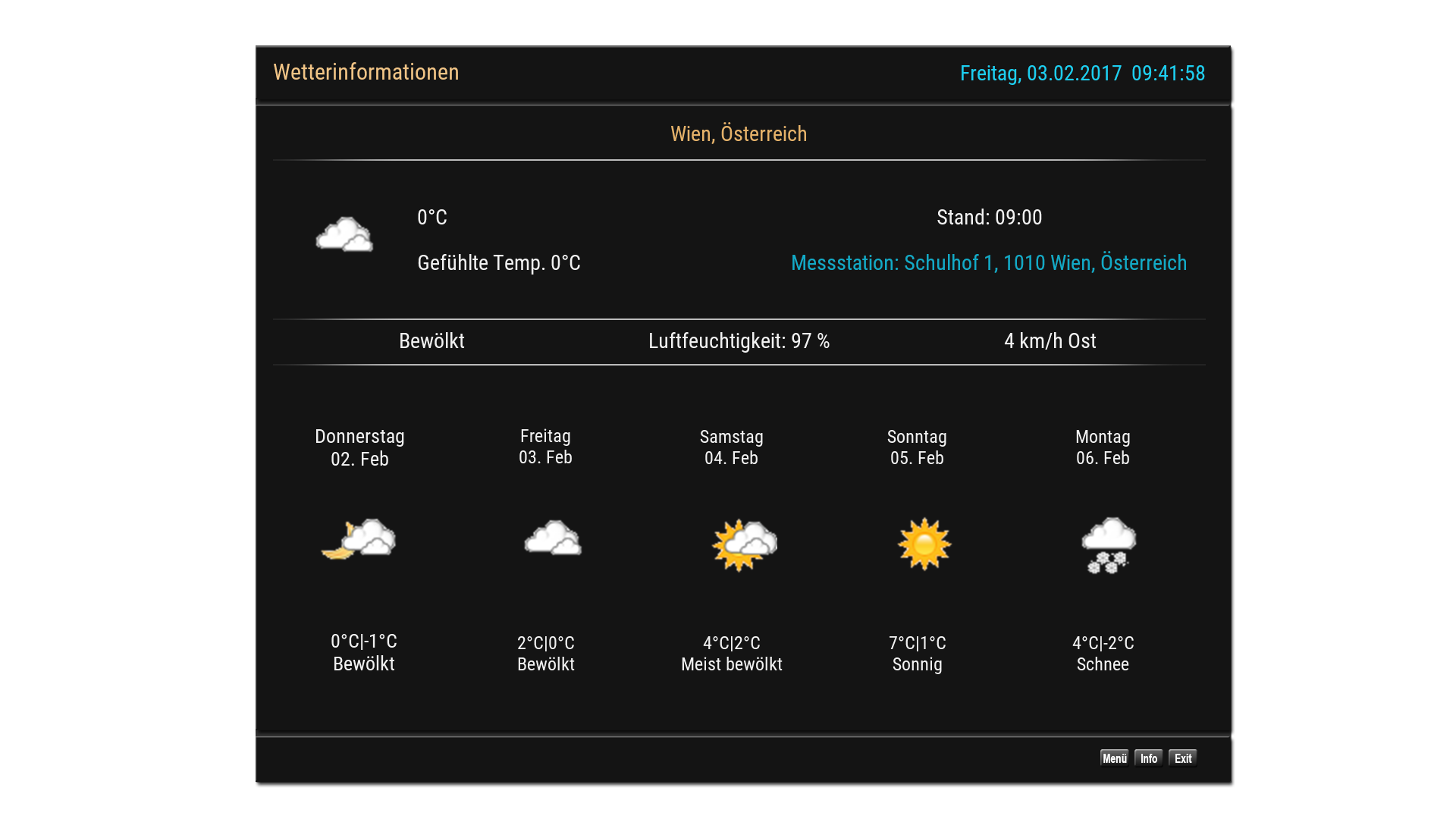 das wetter wird in der Channelselection angezeigt. Das Wetter Plugin über die blaue Taste.