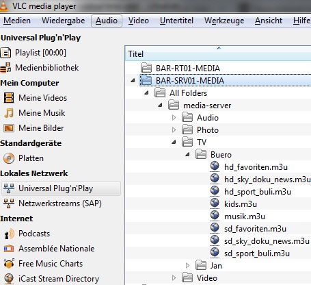 Per VLC klappt es auch, man muss leider nur etwas länger warten, bis VLC die DLNA-Verzeichnisse anzeigt.
