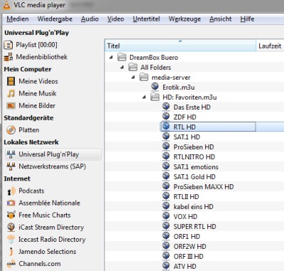 Zweites Thema ist, dass ich die Favoriten meiner Dream als m3u exportierte und auf meinem mediatomb-Server bereitstellte. VLC benötigt eine Ewigkeit, bis die Daten meines DLNA-Servers überhaupt angezeigt werden. Wenn sie jedoch angezeigt werden, ist das Abspielen auch möglich. Lässt sich das Verhalten evtl. etwas beschleunigen? Andere Clients listen den Inhalt meines DLNA-Server sehr schnell auf, spielen/listen aber keine von der Dream gespeicherten m3u`s ab.