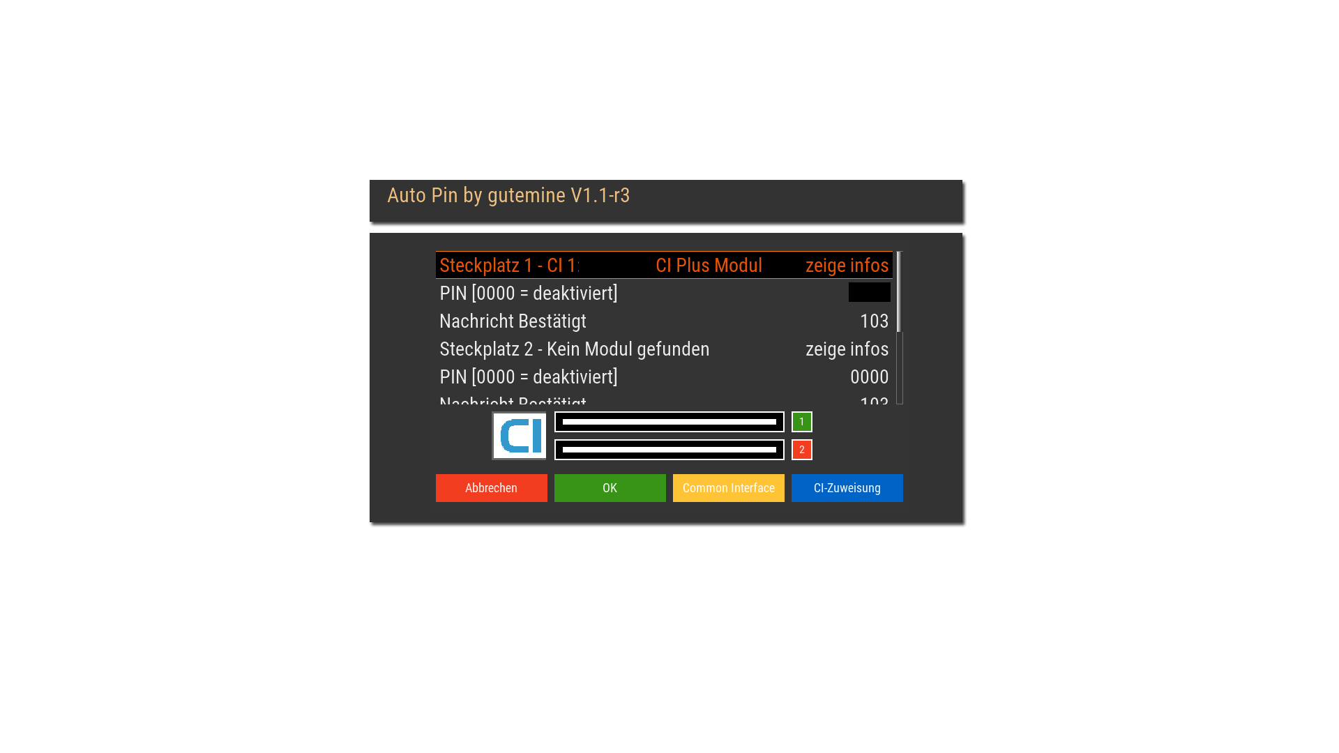 Ich habe jetzt mal die 1.2er drauf gemacht. CI+ läuft aber im Auto-Pin Plugin wird der Slot rot angezeigt. Und wie startet/stoppt man aus dem Plugin heraus?