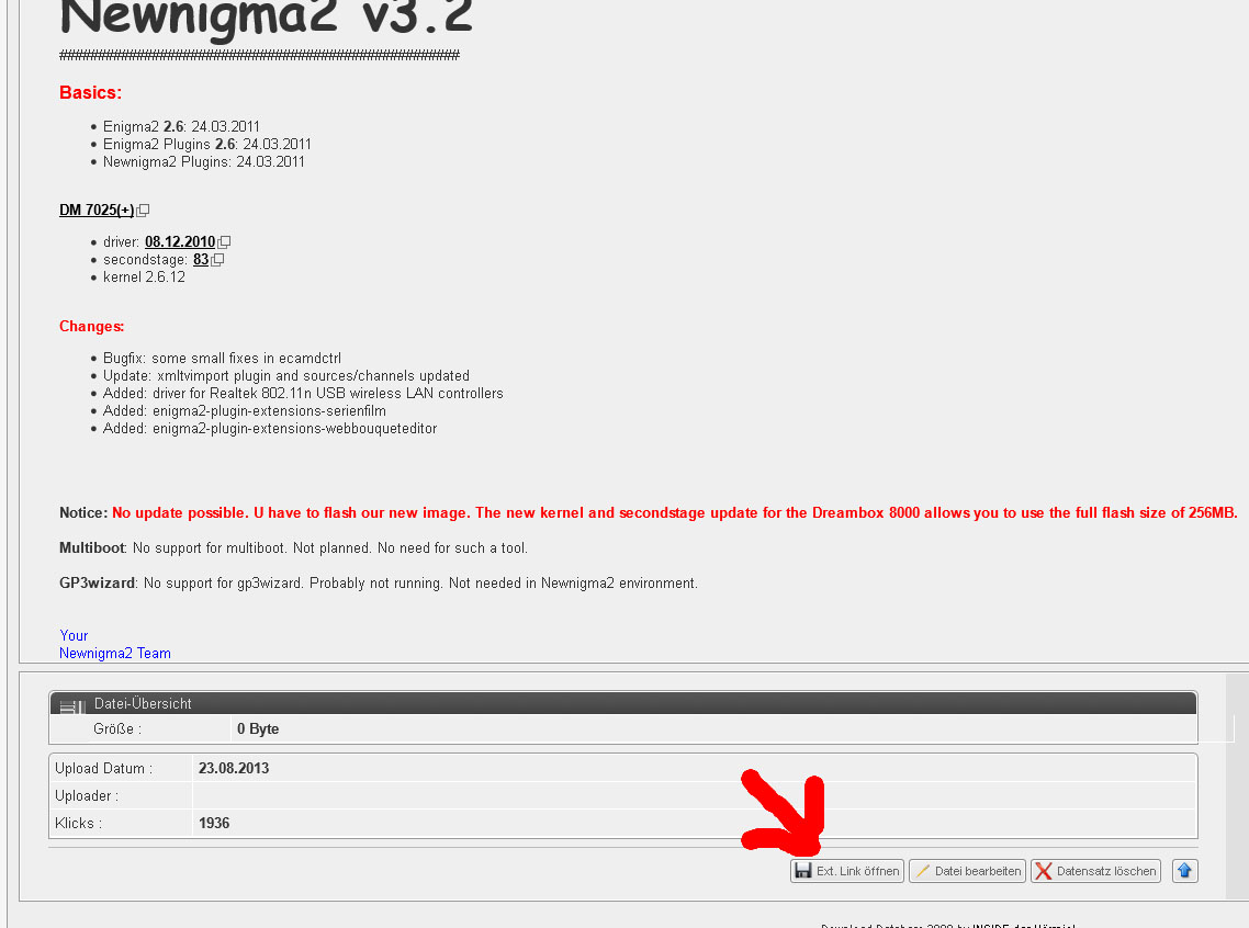 bin gerade auf der Suche nach einem Image für meine alte DM7025. Wurde das Newnigma² Image für die DM7025 aus der Database gelöscht? Den Eintrag gibt es schon noch, allerdings ist am Ende der Seite (wo sonst der Download Link steht) nichts zu sehen. Dateigröße = 0 Byte