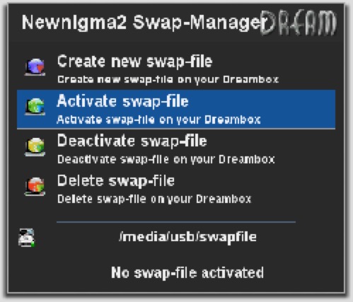 Ich möchte gerne auf meiner Dm500HD eine Swapfile über meinen gemonteten Usb_stick einrichten.Habe SwapManager installiert und es lästt sich auch ein Swapfile erstellen aber nicht aktivieren kann mir vielleicht jemand weiter helfen. Danke