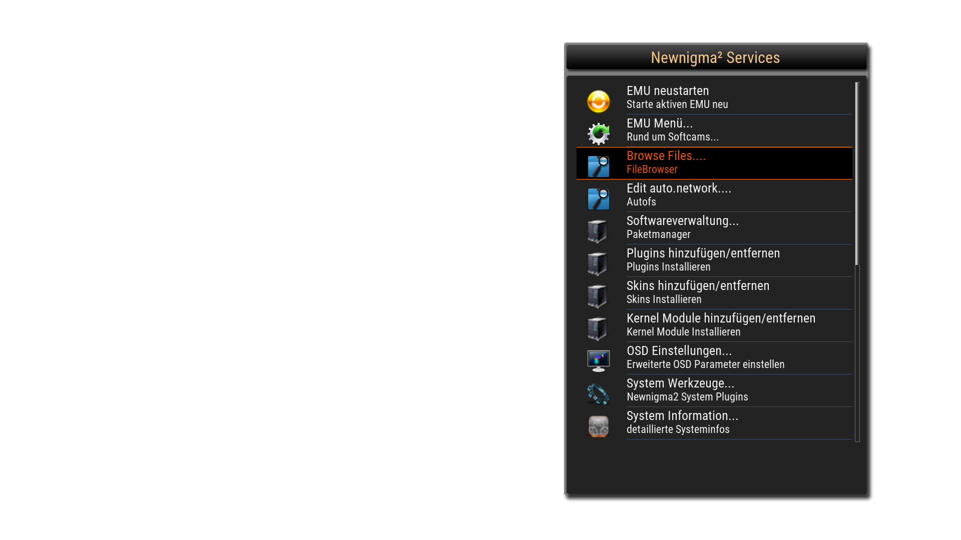 Der newnigma2 Filebrowser ist unsere eigene Entwicklung eines FileBrowsers, mit einigen Funktionen mehr.
