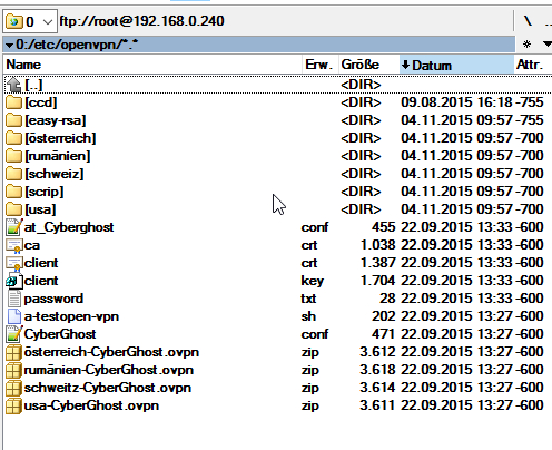 5. Mittels FileZilla (oder anderes FTP Programm) Dateien (ca.crt, client.crt, client.key, password.txt, openvpn.ovpn) ins Verzeichnis /etc/openvpn/ kopieren
