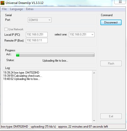 In dem moment als der Upload fertig ist und die Seite mit "writing to Flash" kommen soll bricht die Netzwerkverbindung zur Box ab (nicht mehr pingbar)