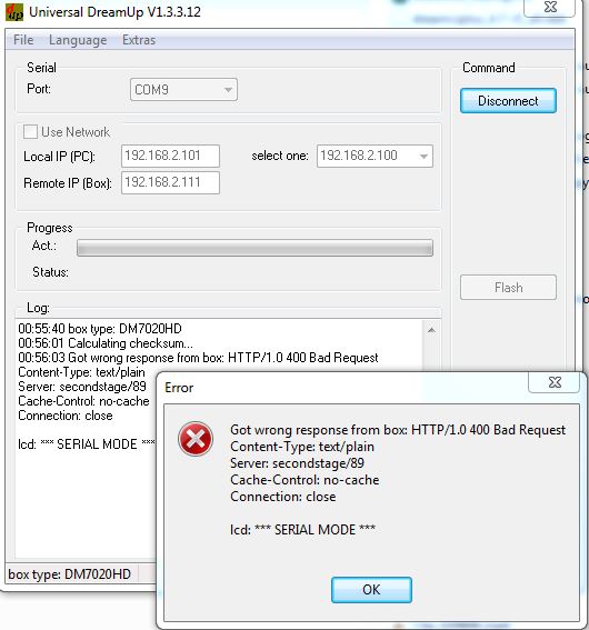 DreamUp seriell probiert - dort kommt nach dem Start via "Flash" und Auswahl des 4.0.18 NFIs ...