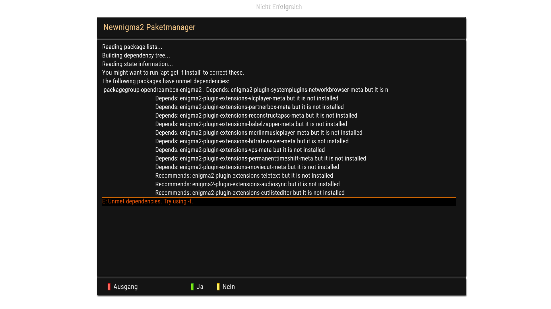 Per telnet/ssh apt-get -f install ausführen. Wie es auch vorgeschlagen wird!