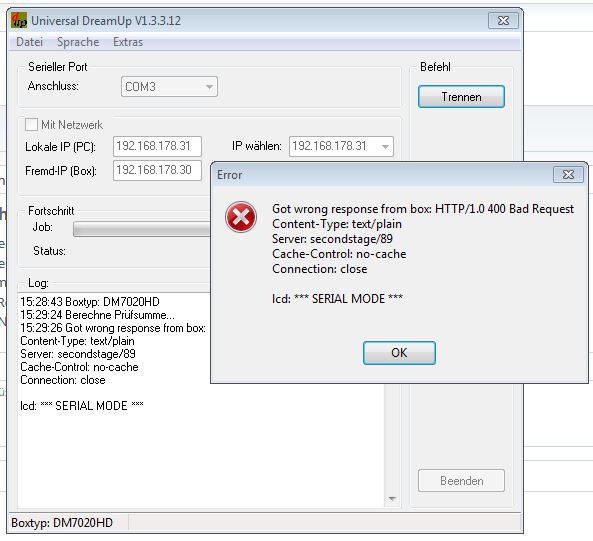 nach Update heute fährt meine DM 7020HD nicht mehr hoch. Ein Flashen ist weder über WebIF noch über Dream Up möglich. Im Web IF bricht es ab mit Zeitüberschreitung der Seite und im Dream Up kommt folgende Meldung nach dem bestätigen von Box Flashen.