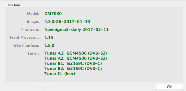 Ich habe jetzt mit meinen DM7080Dm fast alles im Griff. Ein Frage habe ich aber noch? Ich betreibe den 7080 mit ein zusätzlicher Dual DVB-C Tuner. Meine Wanddose hat nur "ein" TV-Anschluss. Darum habe ich ein Hama Splitter verwendet (Durchgangsdämpfung 3.5dB, Entkupplung 22dB). Auf den 2. Tuner empfange ich hierdurch 3 Kanäle weniger. Der SNR der Sender liegt so zwischen 35.75 und 37.25? Ist das Signal stark genug?