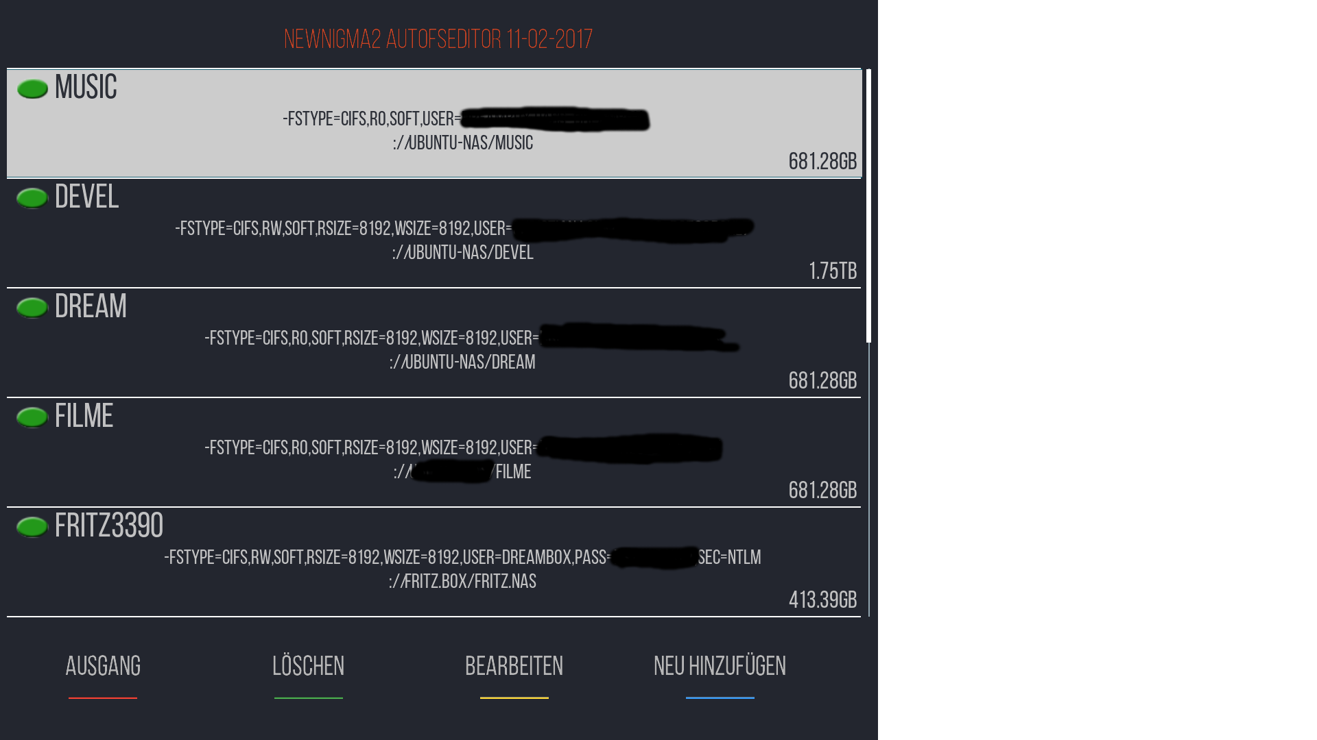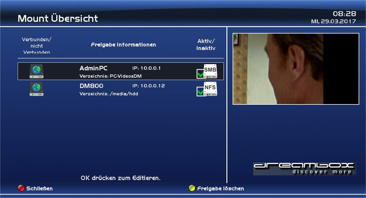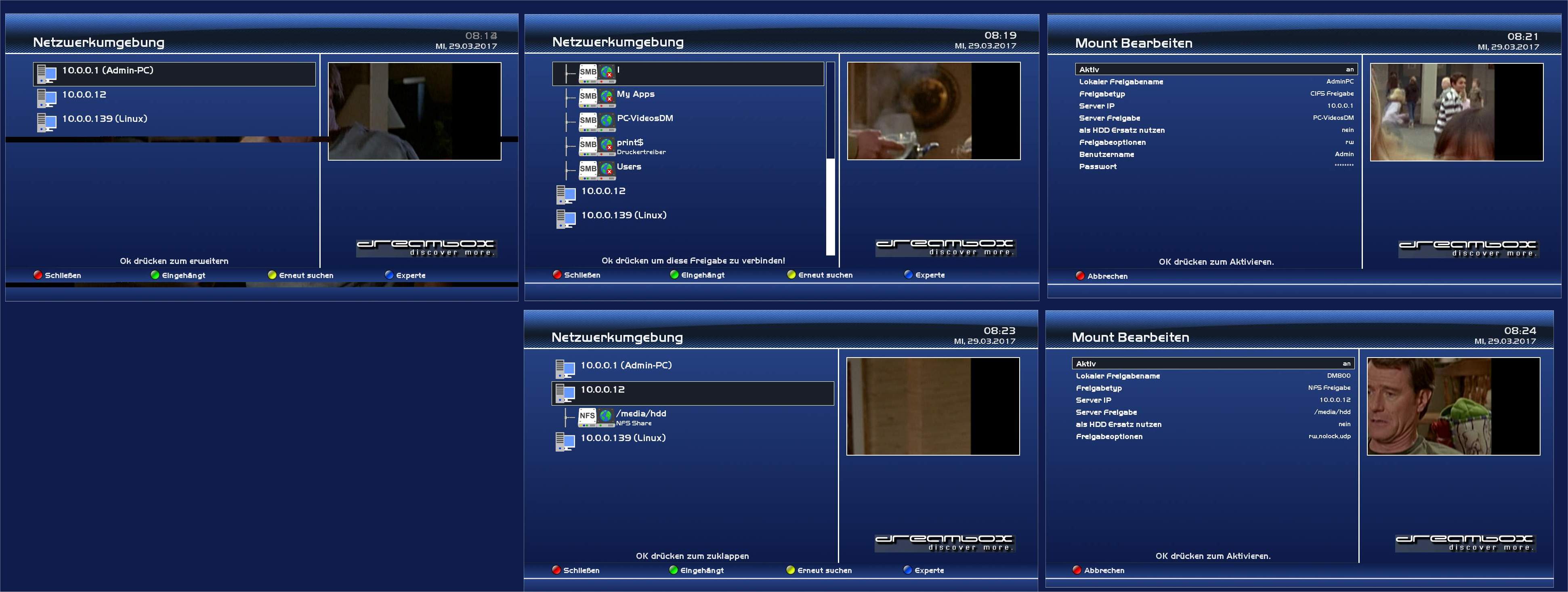 mit der DM900 auf die DM800 auf die Filme zugreifen (/media/hdd/movie) und eventuell noch auf eine Freigabe am PC mit älteren, gesicherten Videos meiner damaligen Dreamboxen zugreifen.