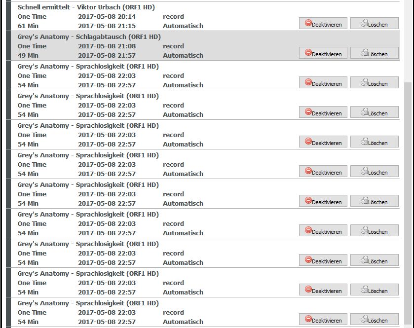 Seit einiger Zeit werden aber praktisch immer Duplikate der Timer auf Sat1 (DE / SD) angelegt. Dabei ist es unabhängig ob die Beginn- und End-Zeit lt. EPG gleich bleibt oder sich um ein paar Minuten verschiebt. Wenn sich Beginn- und End-Zeit ändern würd ichs ja noch verstehen, obwohl das auf anderen Sendern auch kein Problem darstellt. Aber wenn es zB. schon einen vorhandenen Timer passend zum EPG gibt und am nächsten Tag ist genau dieser ein 2. Mal mit gleicher Beginn- und End-Zeit angelegt, dann paßt da was nicht. Und am folgenden Tag ist der Timer dann sogar ein 3. Mal da.