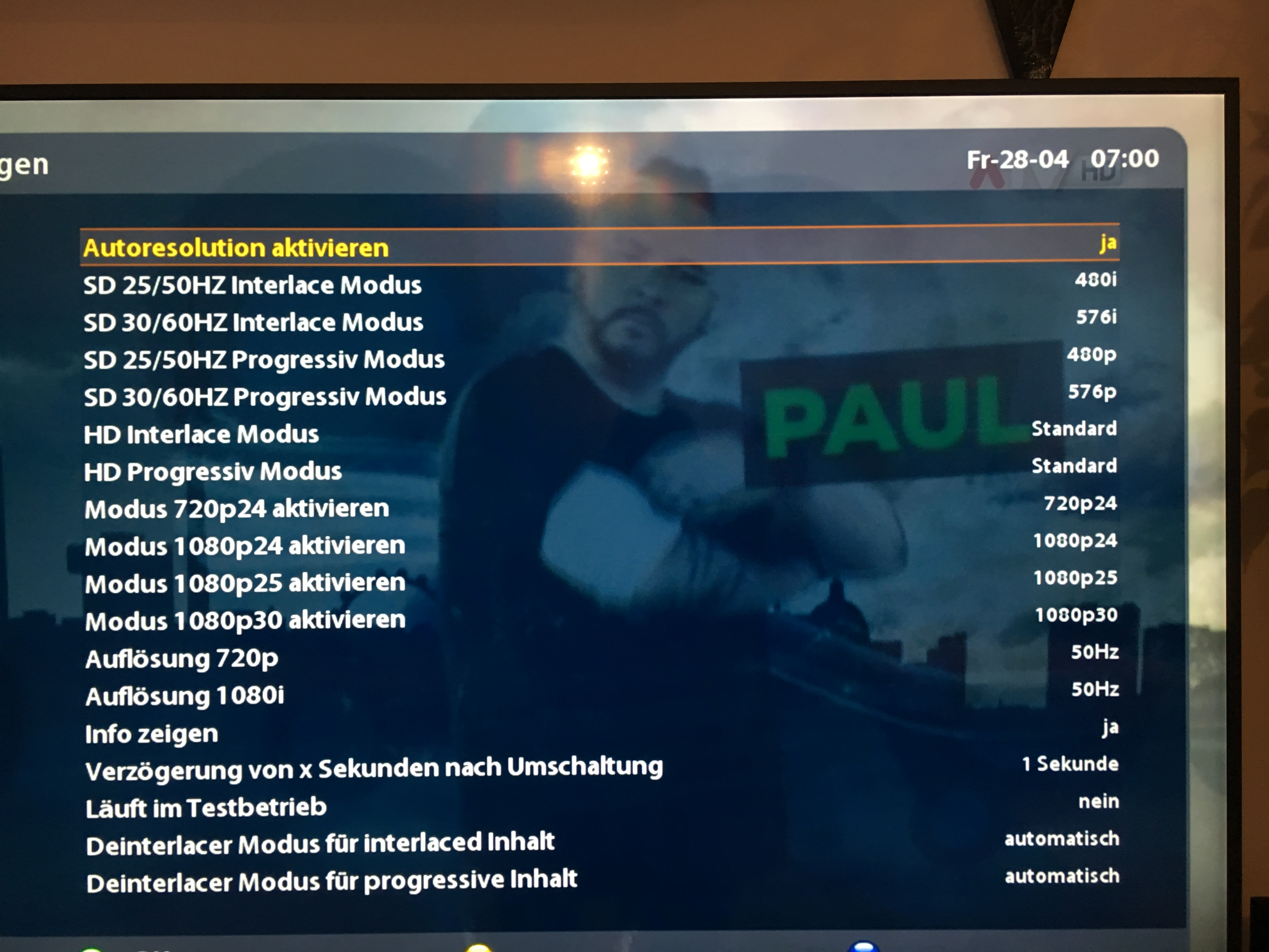 Mit diesen Einstellungen ereiche ich die beste Bildqualität, wobei man sich auf jeden Fall mit den Einstellmöglichkeiten des Fernsehers beschäftigen sollte, denn die Werkseinstellungen sind meist immer zu verbessern. Gerade beim deinterlacen, d.h. Zeilensprungbild auf Vollbild hochrechnen, (es werden also zwei unterschiedliche Umrechnungsprozesse durchgeführt!) kann man mit den falschen Einstellungen massive Ruckler provozieren, was insbesondere bei Laufschriften und schnellen Bewegungen auffällt. In diesem Bereich war bei meinem LG die Firmwareaktualisieren segensreich, weil sich danach das deinterlacing verbessert hat.