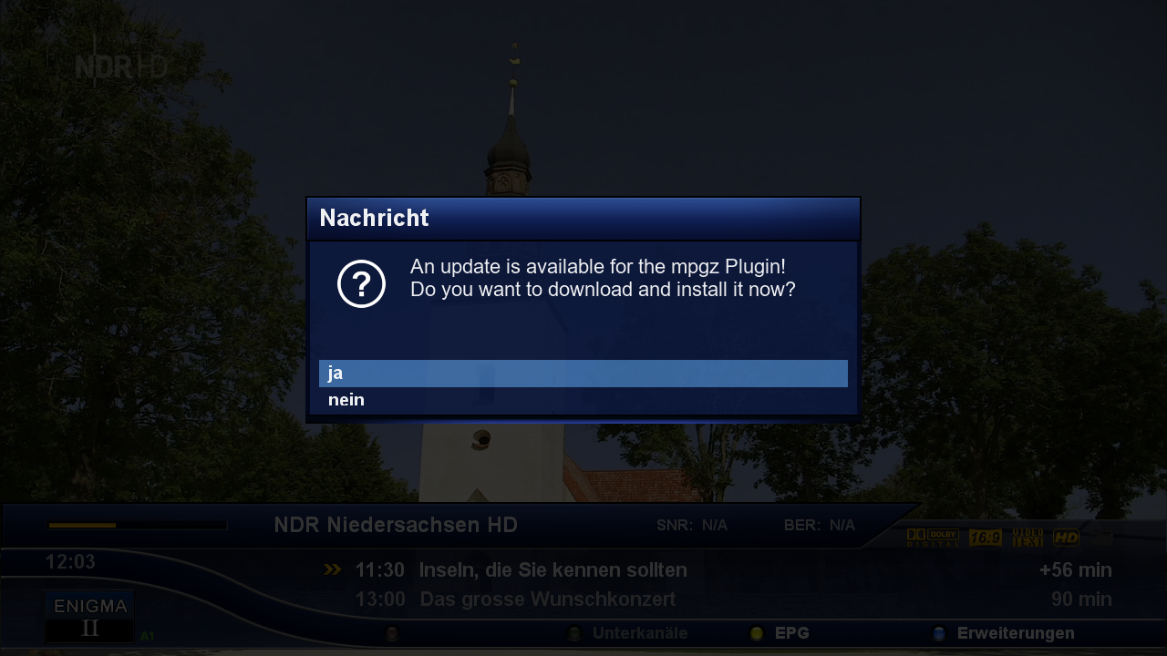 Habe soeben bei meiner 7080 geupdatet. Nun kommt nach jedem Neustart die Meldung: An update is available for the mpgz Plugin! Do you want to download and install it now?