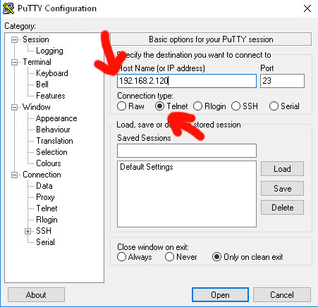 Nach dem Start von Putty, Telnet oder SSH auswählen und die IP-Adresse der Dreambox eingeben, anschließend auf "Open" klicken.