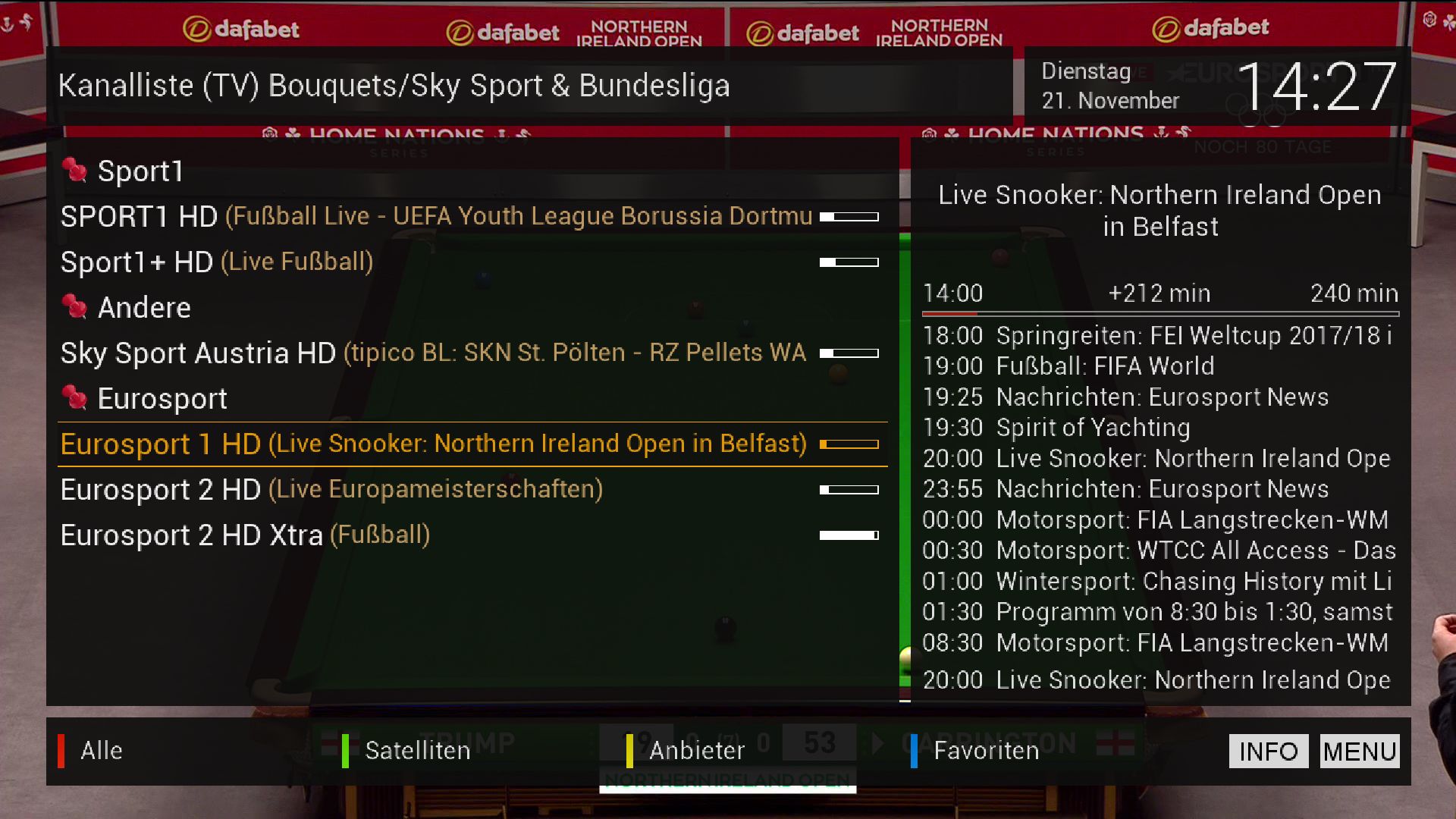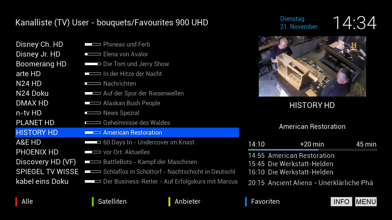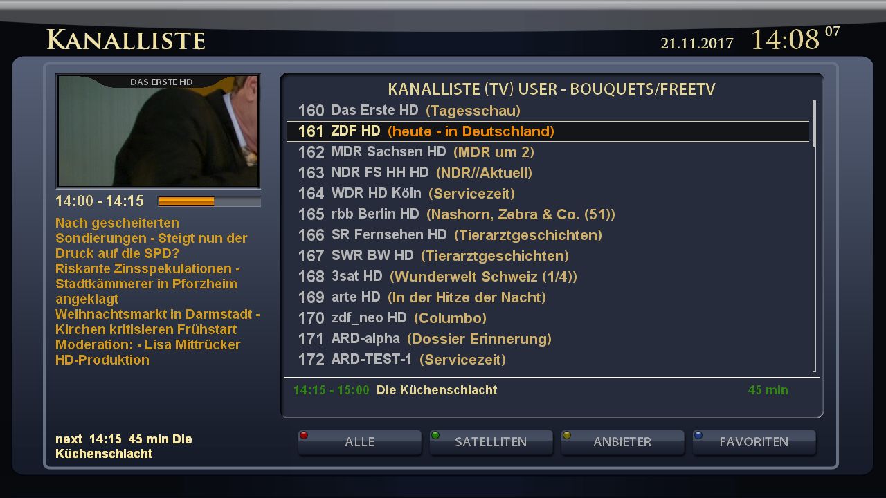 ich suche jetzt schon seit 3 Wochen einen Skin, bei dem ich in der Kanalliste auf der anderen Seite eine Programmvorschau und Mini TV habe. Die Sedebeschreibung brauche ich nicht, dafür möchte ich auf Info drücken. Bis jetzt habe ich viele gefunden bei denen ich die Kanalliste aufrufe und auf der anderen Seite die Sendebeschreibung und die Programmvorschau habe, aber wenn ich den MiniTV zu schalte habe ich keine Programmvorschau mehr und nur noch die Sendebeschreibung. Ich will aber MiniTV und Programmvorschau.