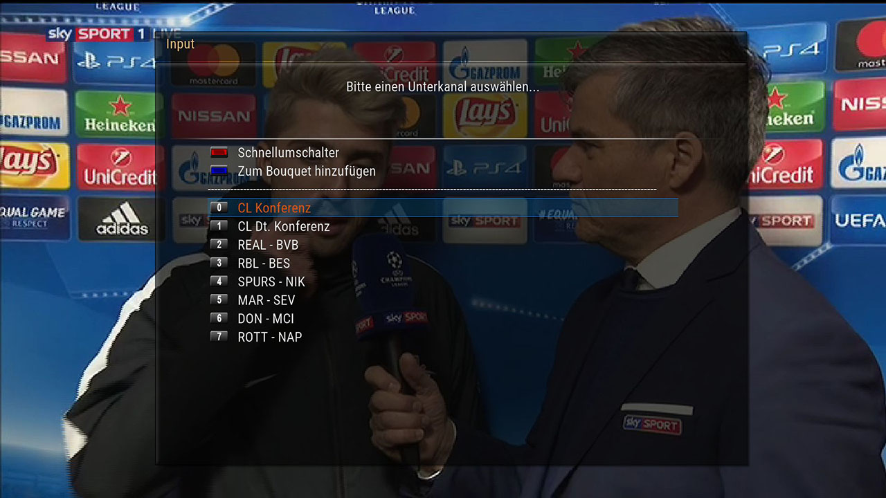Weshalb funktionieren den die Unterkanäke nicht richtig, gerade ist es nicht möglich die Einzelspiele der CL über die grüne Taste auszuwählen. Nur 3 Option egal ob auf OE2.0 auf einer DM8000 HD oder auf OE2.5 auf einer DM 7080 HD