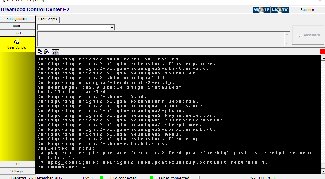 Der Versuch, die Dreambox upzudaten oder plugins zu löschen oder zu installieren kommt eine Fehlermeldung mit: