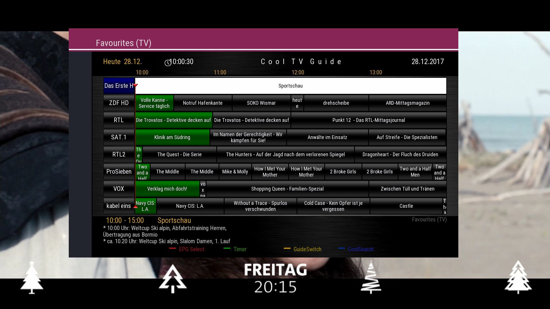 Hallo, dazu hätte ich jetzt eine Frage. Ich habe mir extra CoolTV installiert (ja funktioniert), da die Ansicht bei mir nicht wie gewünscht ist. Ich finde keine Möglichkeit den Zeitstrahl einzustellen. Bisher dachte ich, dass das einfach nicht vorhanden ist, klingt ja nun nicht so. Mal als Vergleich die Screenshots.