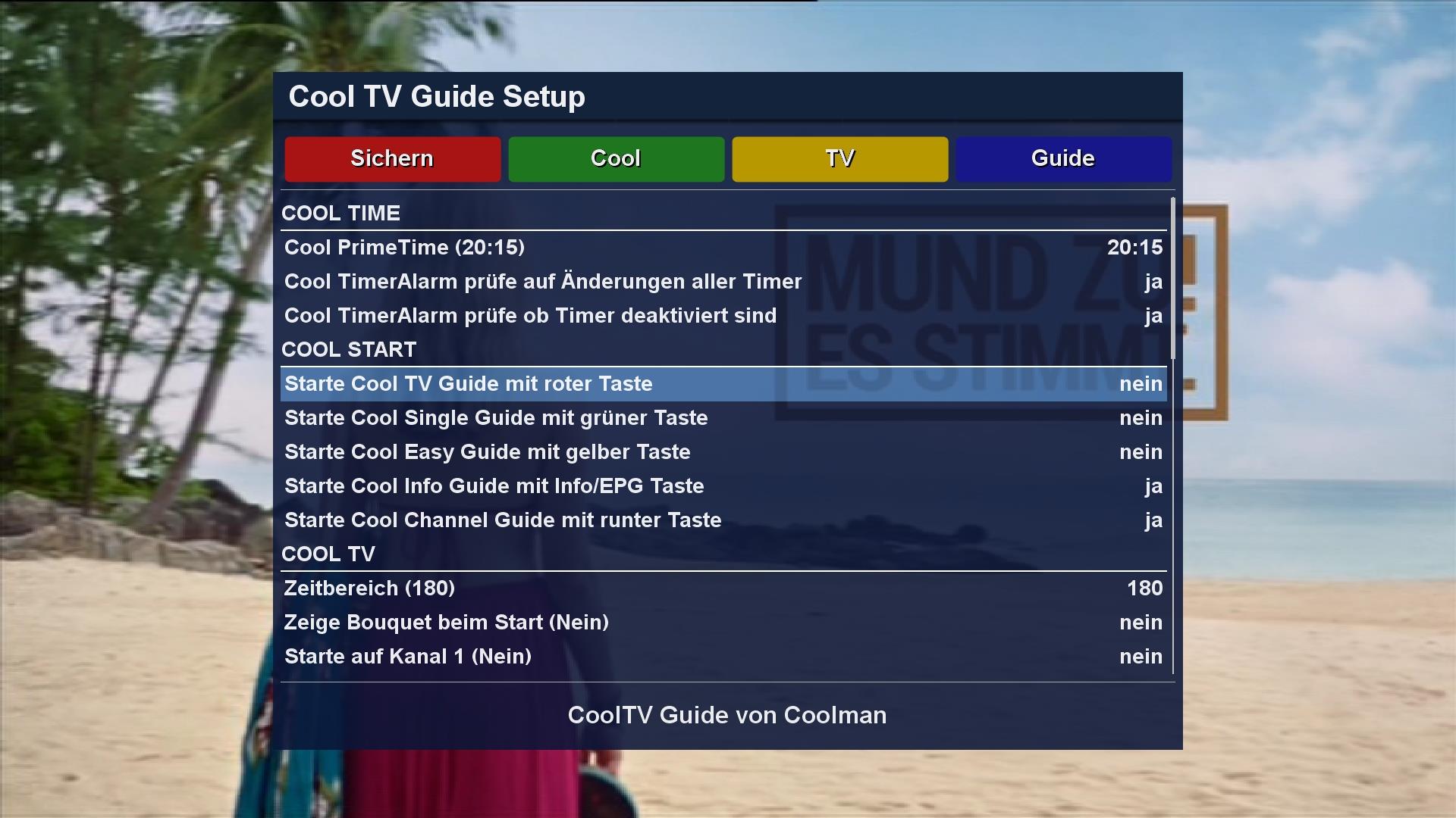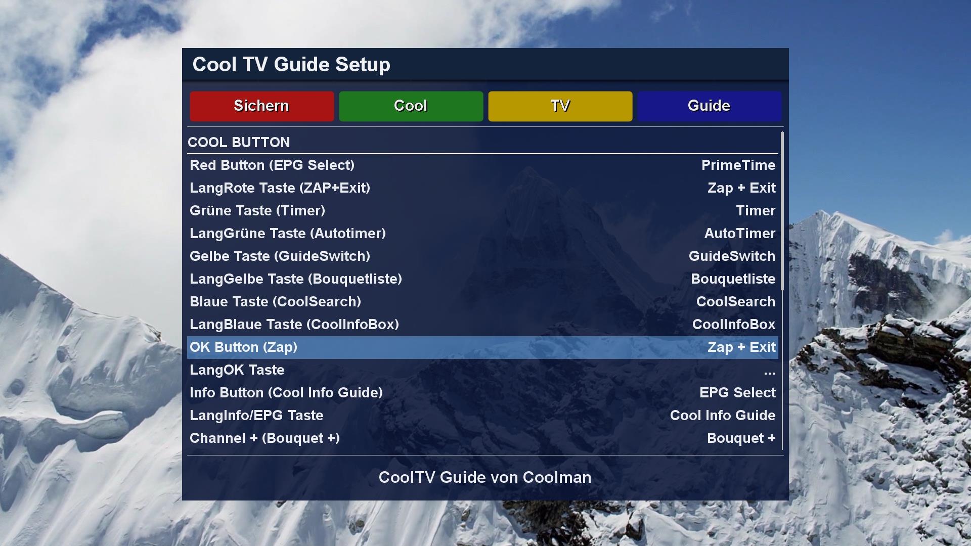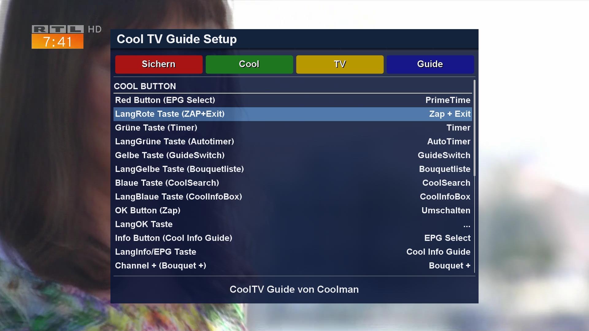 Was ich nicht ganz begreife ist, dass wenn ich im "CoolTvGuide" (also die grafische Multiepg Variante) einen Sender mit "OK" auswähle, zwar der Sender umschaltet aber das Menü immernoch zu sehen ist. Hat jemand eine Ahnung, wie ich es hinbekomme, dass nach dem drücken von "ok" für den Senderwechsel auch das Menü mit verschwindet? Ich möchte halt nicht immer erst "ok" drücken für umzuschalten und dann noch zusätzlich "exit" um das Menü wegzubekommen.