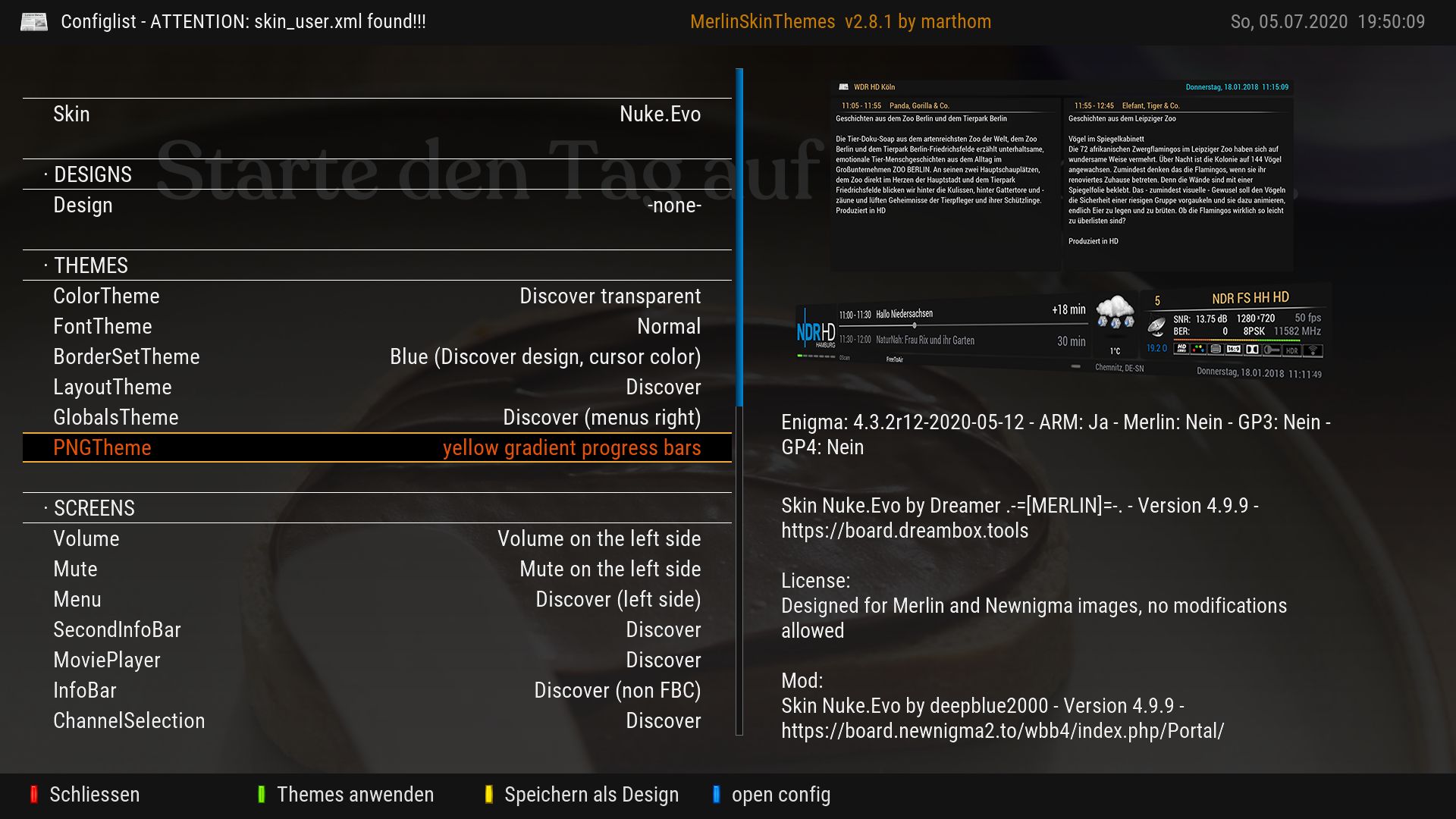 Hinweis: Falls Fälle auftreten wo Optionen in MerlinSkinThemes nicht zur Verfügung stehen bzw. die aktuelle Version noch mit 2.6.1 angezeigt wird, einmal MerlinSkinThemes in der Softwareverwaltung deinstallieren, neu starten und dann die aktuelle Version von MerlinSkinThemes per Softwareverwaltung wieder installieren. Es gab vor einer Weile eine Umstellung des Paketes, so dass das aktuelle Paket erst sichtbar und installierbar wird, wenn die ältere Version deinstalliert ist.