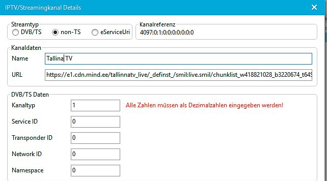 ich habe mit DreamboxEdit 7.2.0.0 drei IPTV Urls in ein bestehendes Bouquet eingefügt, Einstellung war Non-TS. Leider laufen alle drei Sender auf der Box nicht, auch wenn ich von Non-TS auf andere Vorgaben wechsele. Die Einträge sehen folgendermaßen aus: