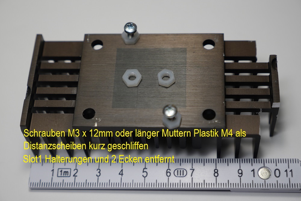 wie in Beitrag 553 angekündigt hier das Ergebnis meiner Passivkühlung für die DM920 mit einem Pentium 3 Kühler für Slot1 Ausführung.
