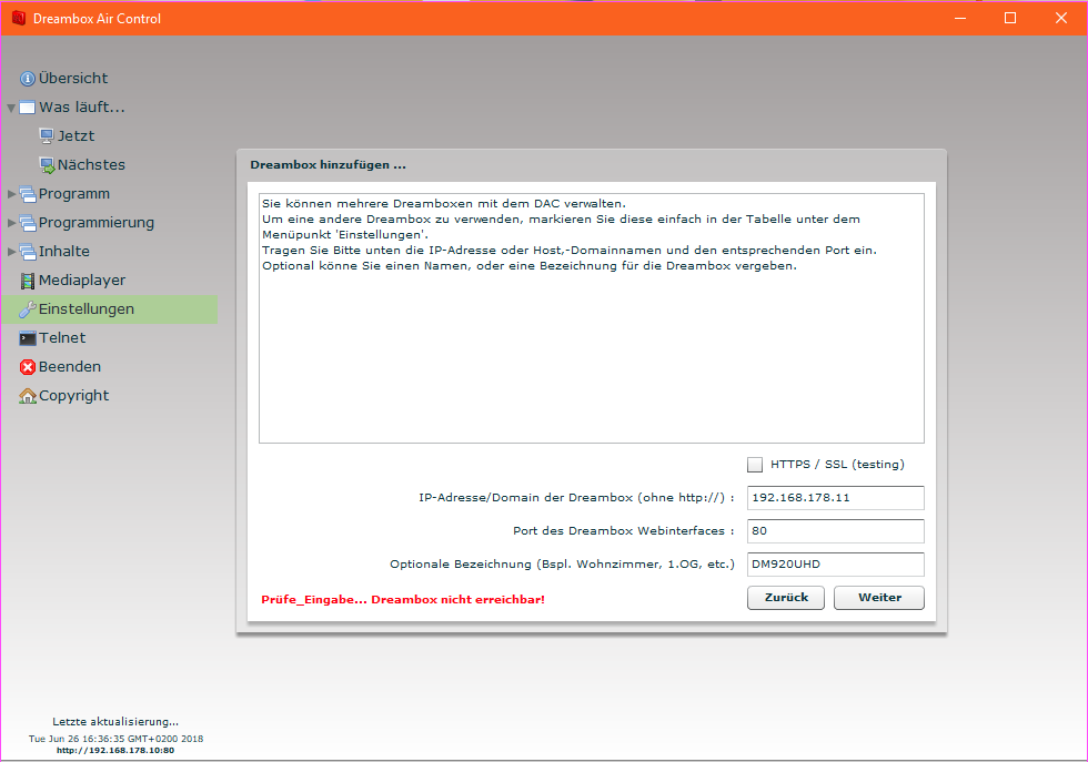 Beim Verbindungsversuch kommt die Meldung: Dreambox nichterreichbar!