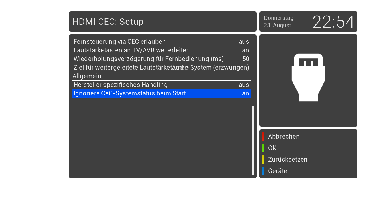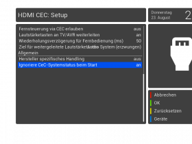 Die Einstellungen "AV-Receiver einschalten", "Lautstärketasten an TV/AVR weiterleiten" sowie "Hersteller spezifisches Handling" haben leider keine Änderung gebracht.