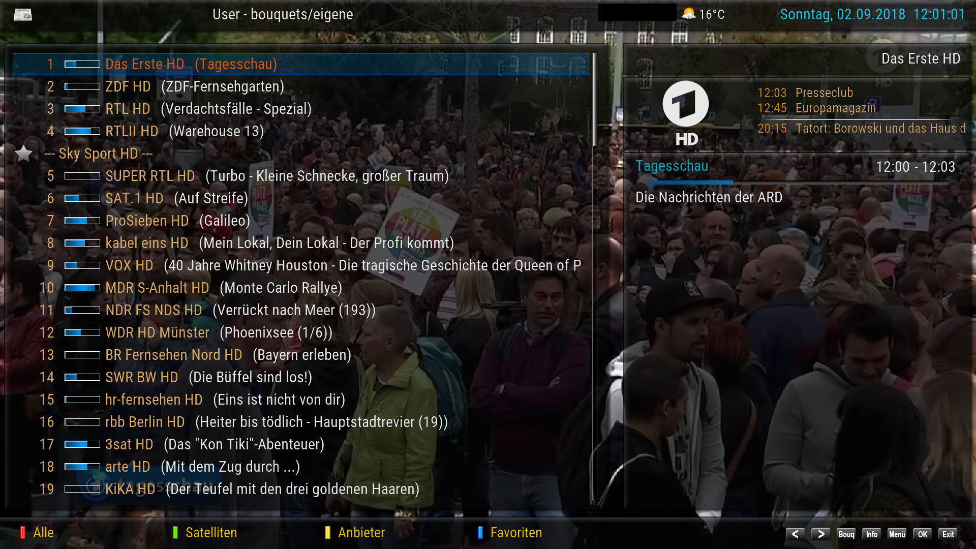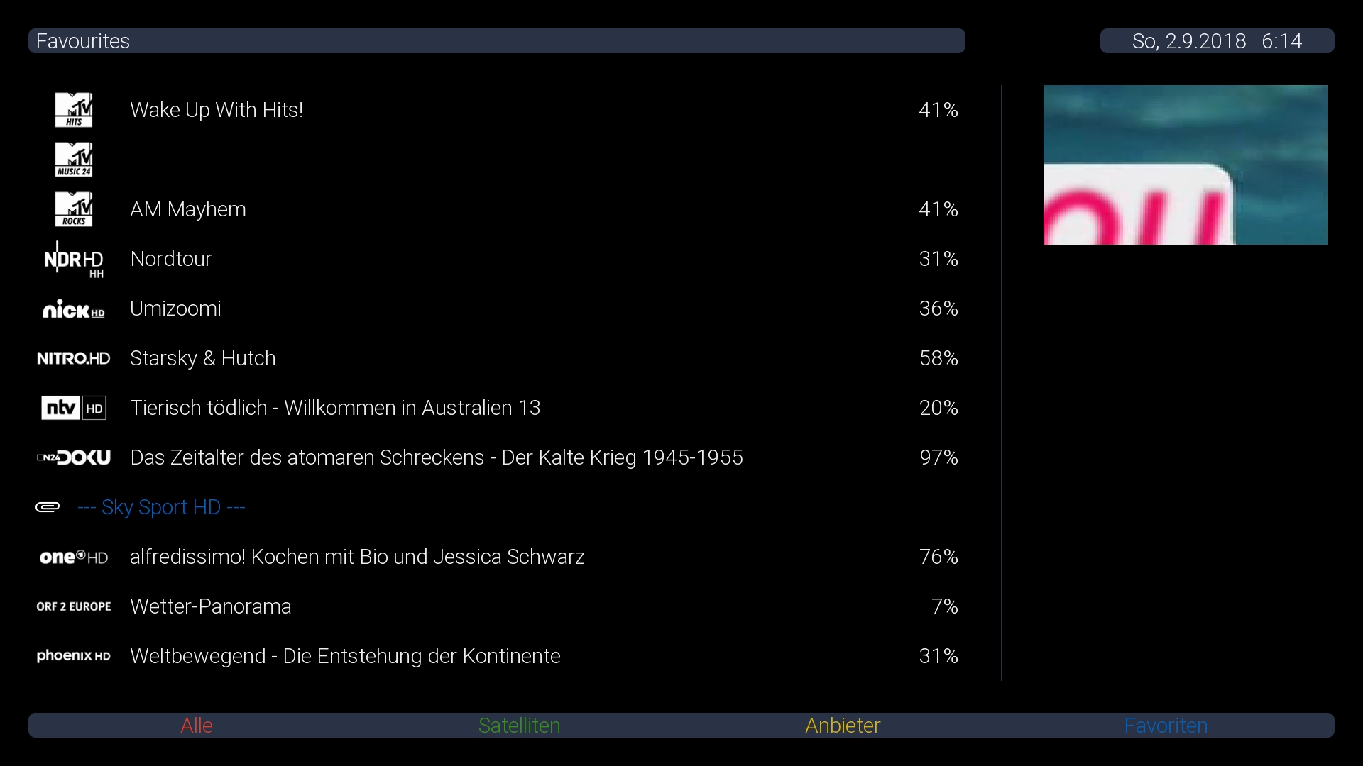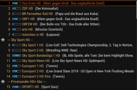 - Die Kanalnummerierung ist total seltsam nun. In der Übersicht (siehe Screenshot) wird Sky Sport 1 HD als Sendernummer 8 angezeigt. Wähle ich den Sender aus (egal ob per "OK" oder per manueller Anwahl von "8" auf der Fernbedienung) lande ich auf Sky Sport 1 HD. Dieser ist allerdings im GUI (die Leiste im unteren Bereich wenn man auf dem Sender ist) nicht als Kanal 8 sondern als Kanal 9 ausgewiesen! Obwohl ich ihn mit "8" manuell anwählen kann!