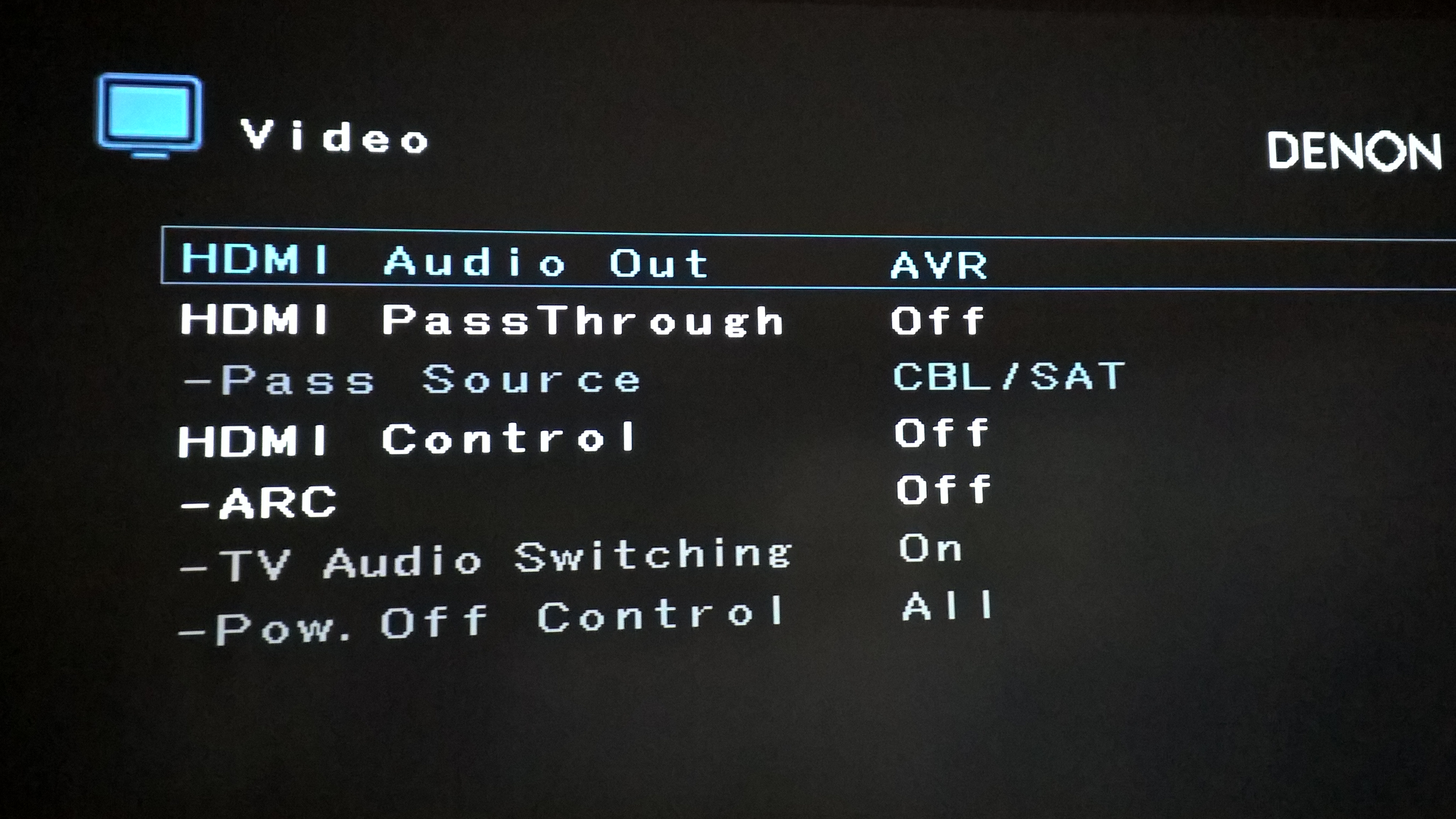 • Dann versuch mal diese HDMI passthrough Einstellung On zusammen mit ACR on im Denon und aktiviere ACR auch mal im Beamer bzw. TV. (Manchmal muss man den Weg von hinten durch den Kopf ins Auge wählen).