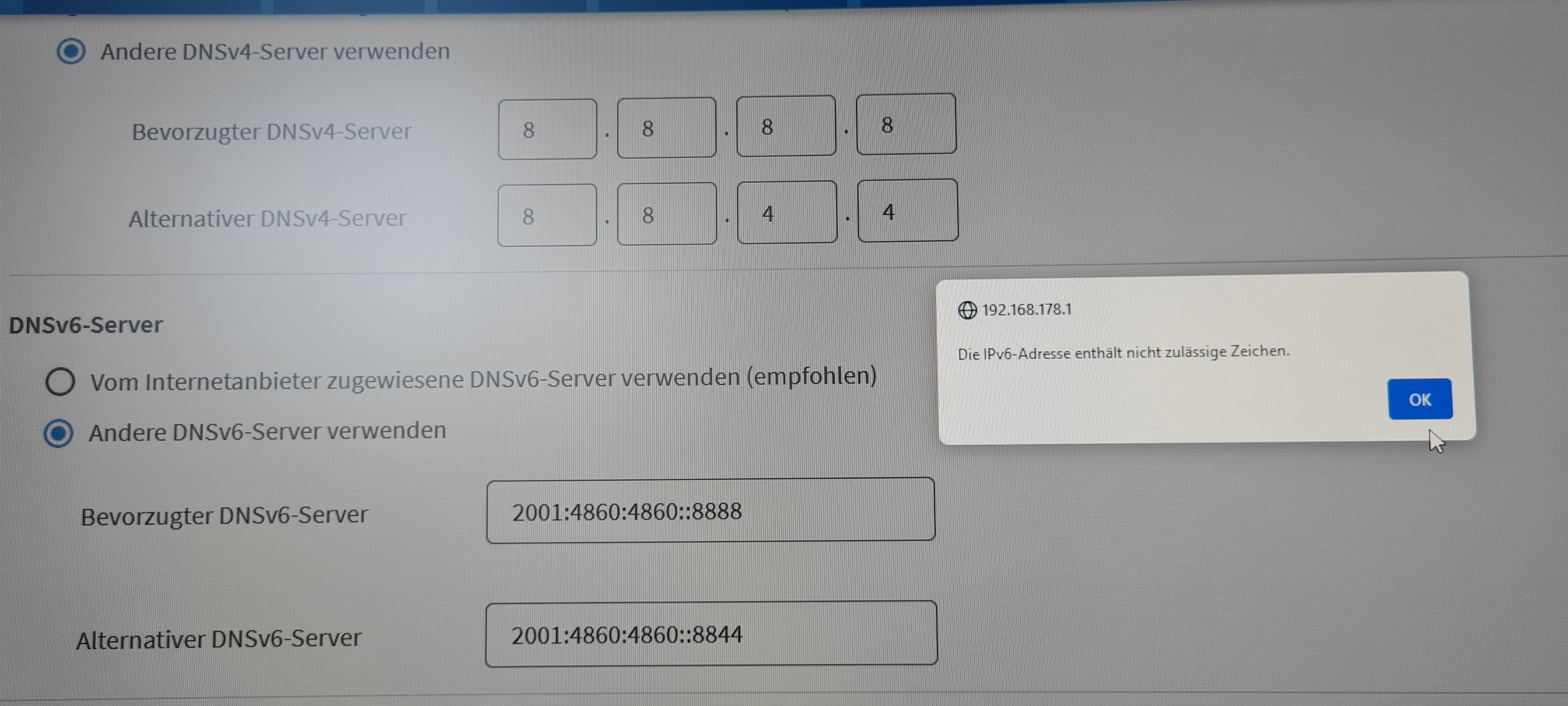 Es ist auch richtig, daß du eine Fehlermeldung bekommst, wenn du die v4-Adressen von Google in der Rubrik v6 eintragen willst.