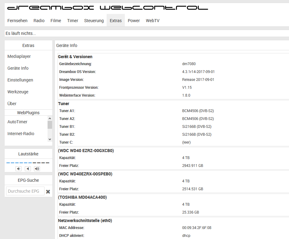 ich habe bei der DB7080 (Gerätedaten siehe Screen) 4 Emfangsmodule eingebaut. Wie kann ich prüfen, ob allebzw. jeder der Empfänger ein einwandfreies Satsignal bekommt. Wenn ich auf 1 Tuner schaue u. gleichzeitig auf 1 oder mehreren anderen Tunern aufnehme, kommt beim Umschalten auf einen anderen Sender immer wieder die Fehlermeldung: Tunen fehlgeschlagen. Welches neue Image soll ich darauf flashen und wie kann ich den jetzigen Status sichern (bleiben z.B. programmierte Aufnahmen erhalten und die installierten Erweiterungen Senderreihenfolge , eigehängte USB-Platten u. NAS usw.).