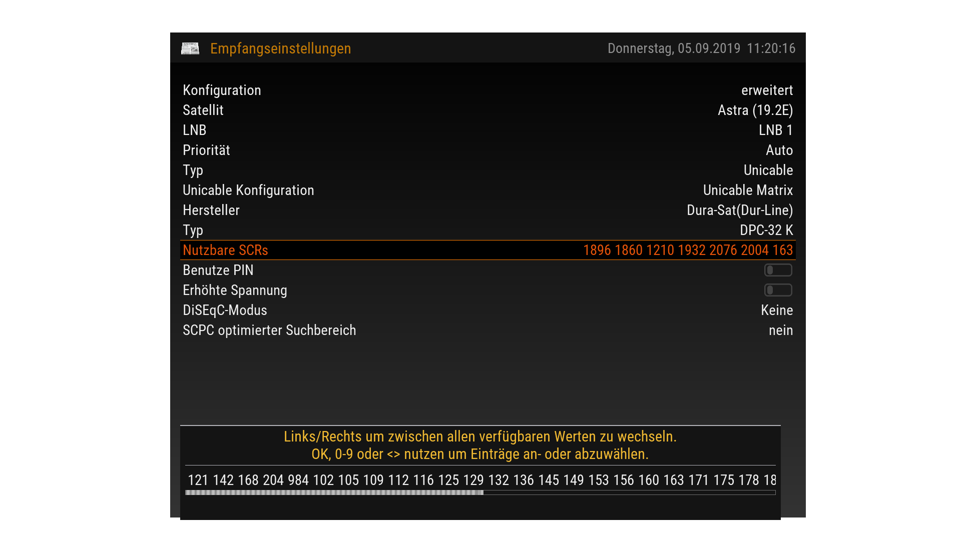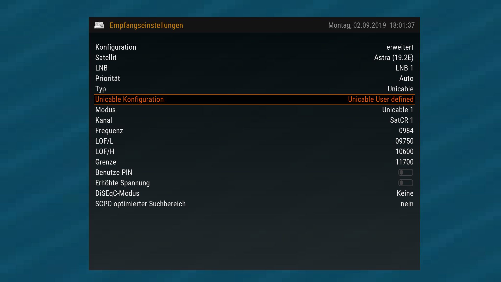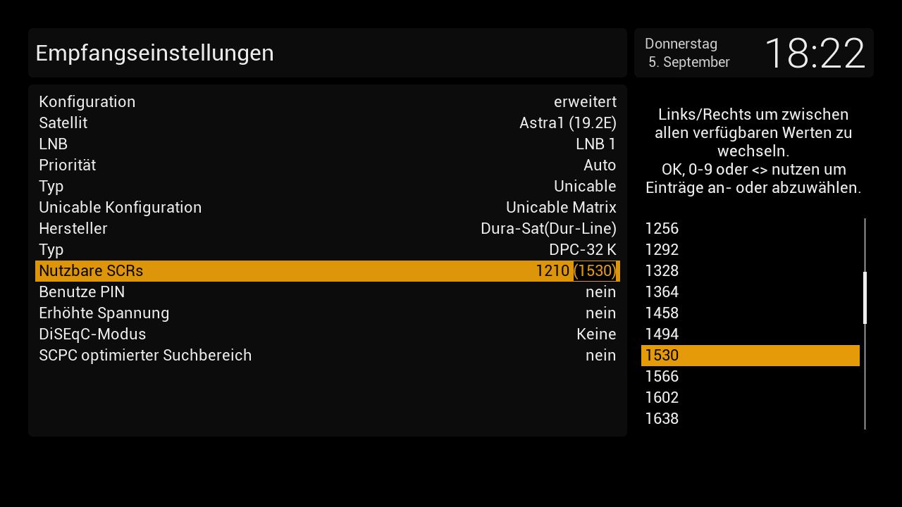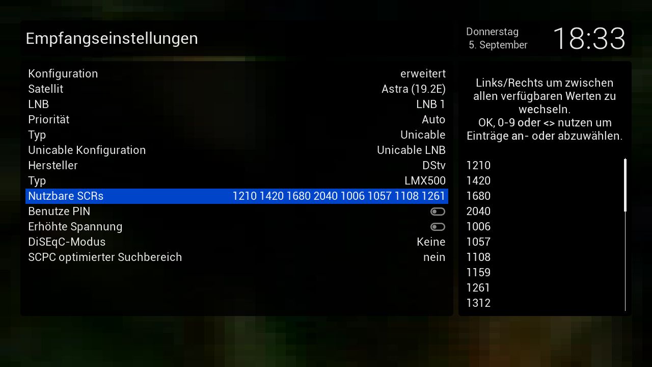 Auch Tuner für mein Unicable EN50607 hat funktioniert. Lediglich die vorgegeben Frequenzen für die Userbänder sind falsch, aber das kann man händisch korrigieren.