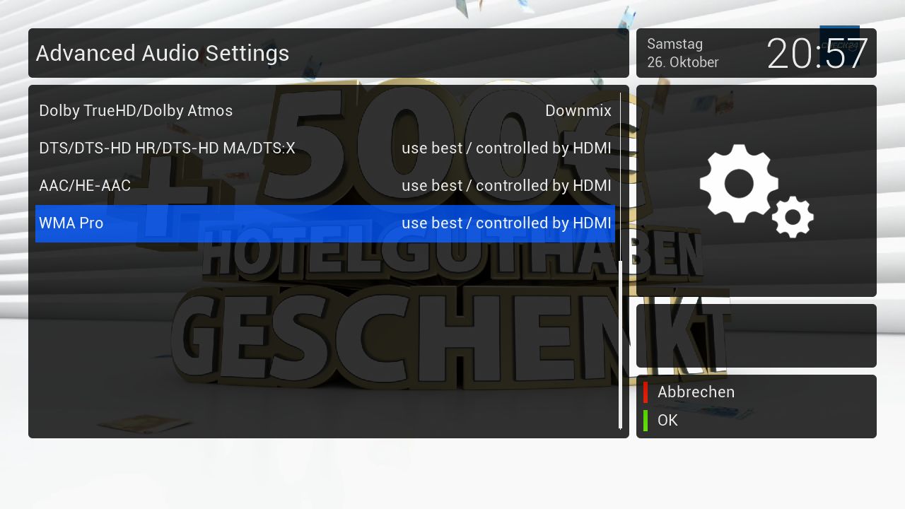 Wenn ich die letzte " Dolby digital über HDMI " aktiviere kommt zwar die DD Übertragung aber bricht je paar Sekunden ab, im Moment bin ich wieder auf " DD Plus automatisch " wo keine DD stattfindet! Eigentlich schade wenn man gute Soundanlage hat. -