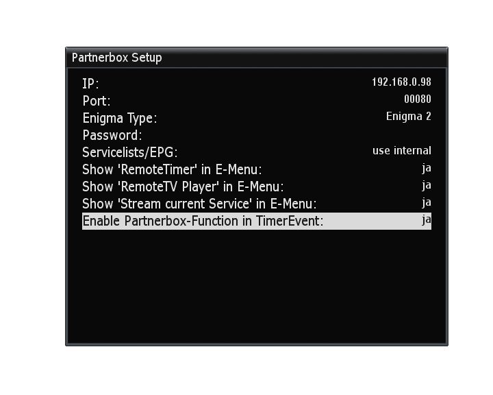 Im Config Menu den Punkt "Enable Partnerbox-Function in TimerEvent" aktivieren.