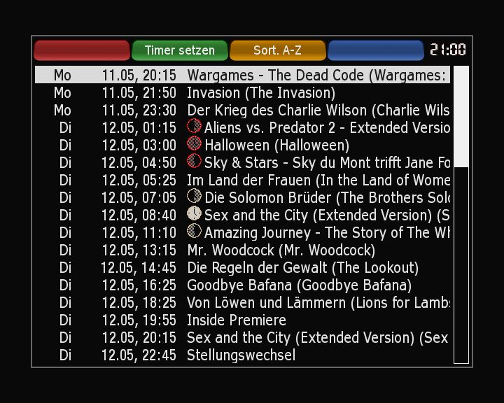 Es können Timer gesetzt, geändert oder gelöscht, die Timerliste der Partnerbox betrachtet und organisiert werden.