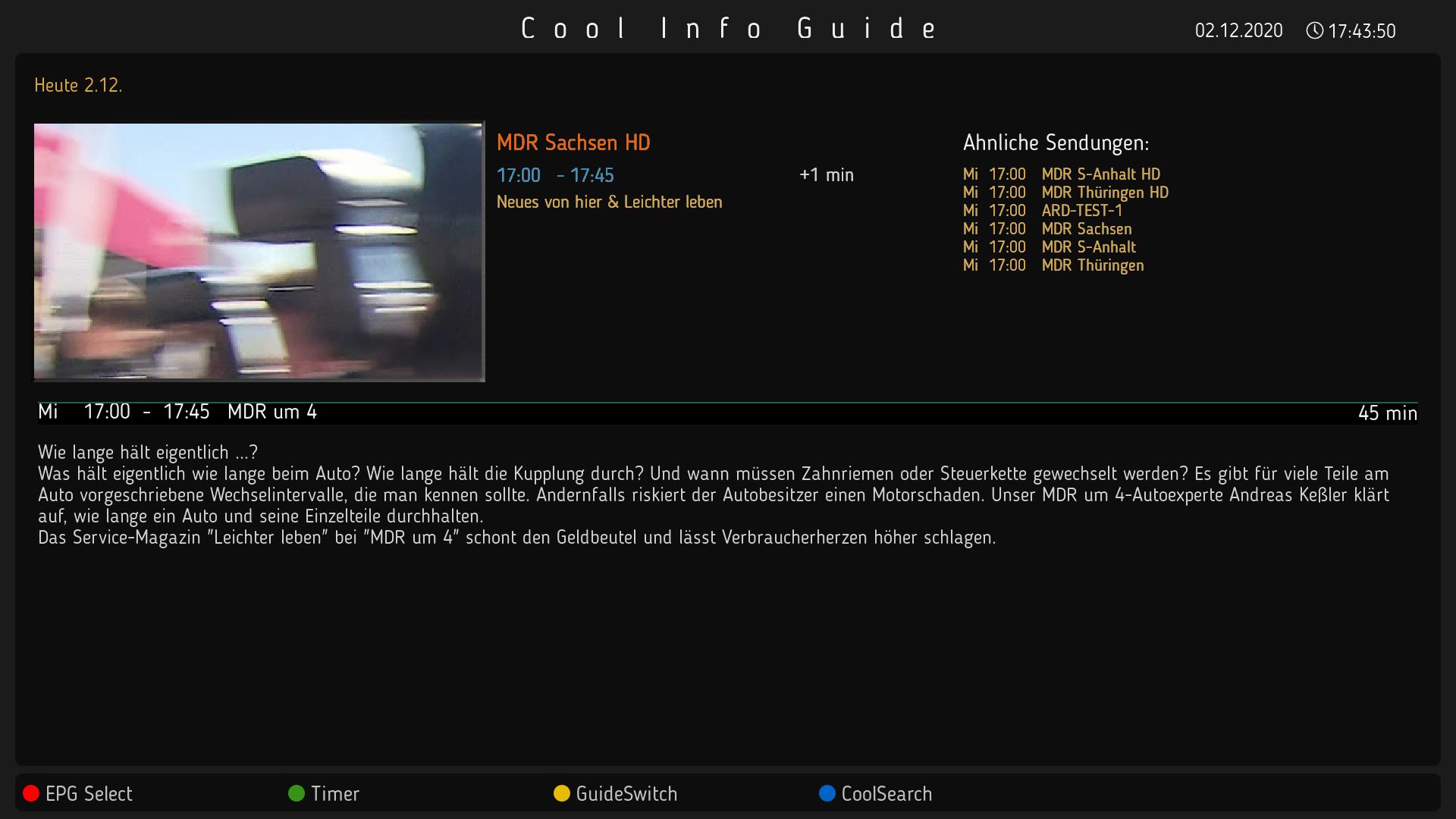 habe mir den Skin jetzt auch drauf auf der DM900 und er gefällt mir sehr gut bis auf kleines Problemchen. Ich habe den CoolTV Guide drauf und der wird mir etwas klein dargestellt. Meine Augen sind leider schon etwas schlechter. Die Box hängt am UHD LG 82007 und ist auf 2160p eingestellt.