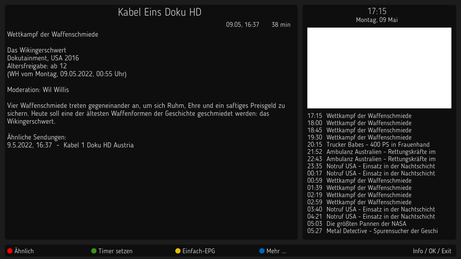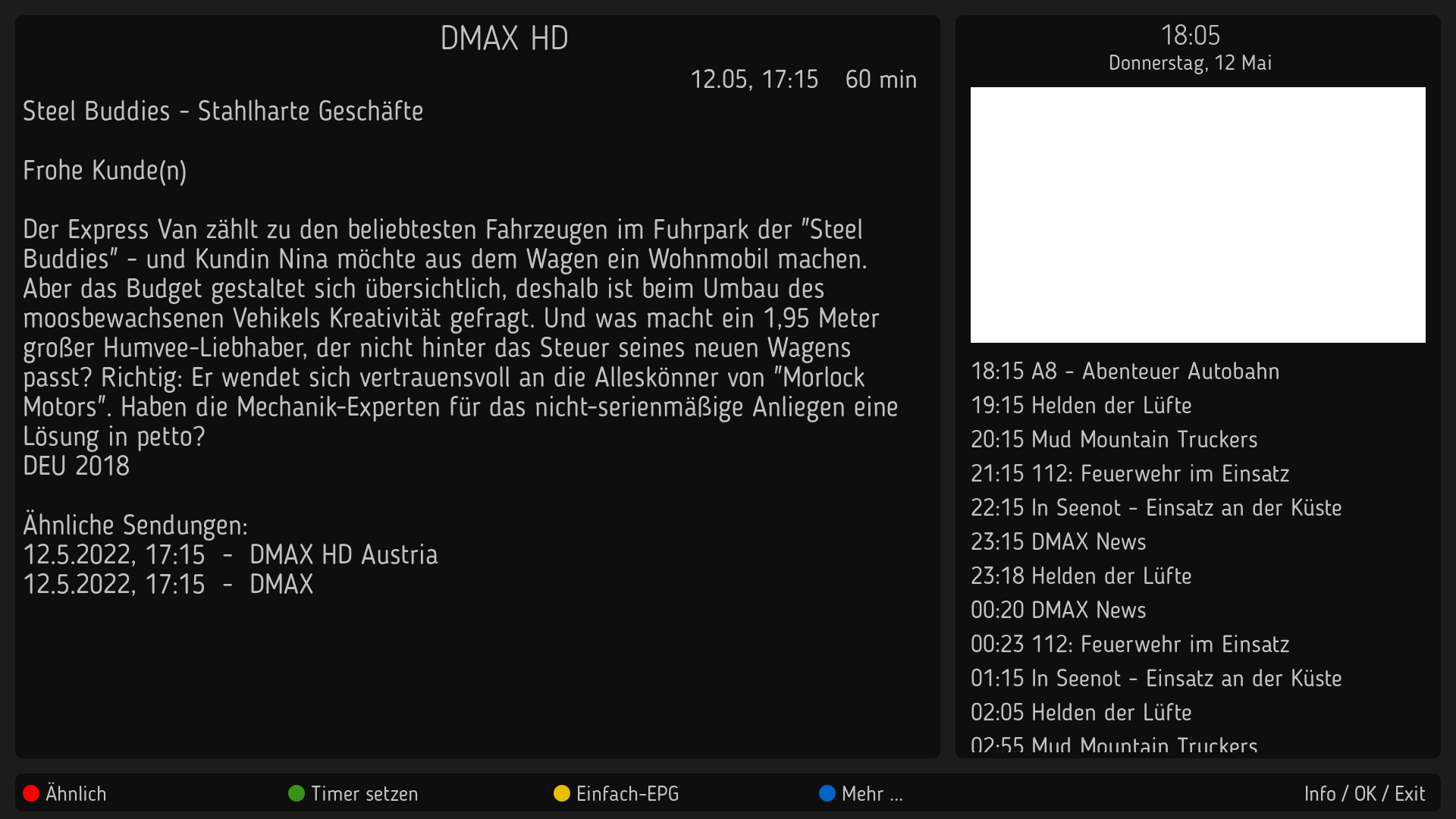 Auch der Einfach-EPG bereitet mir noch Kopfzerbrechen. Die Eventbeschreibung konnte ich einstellen, auch auf FlowRunningText, jedoch für die Liste (linkes Fenster) suche ich die Einstellung für Textgröße und Zeilenhöhe. Einfach (font="Regular;34") einsetzenbringt den greenscreen