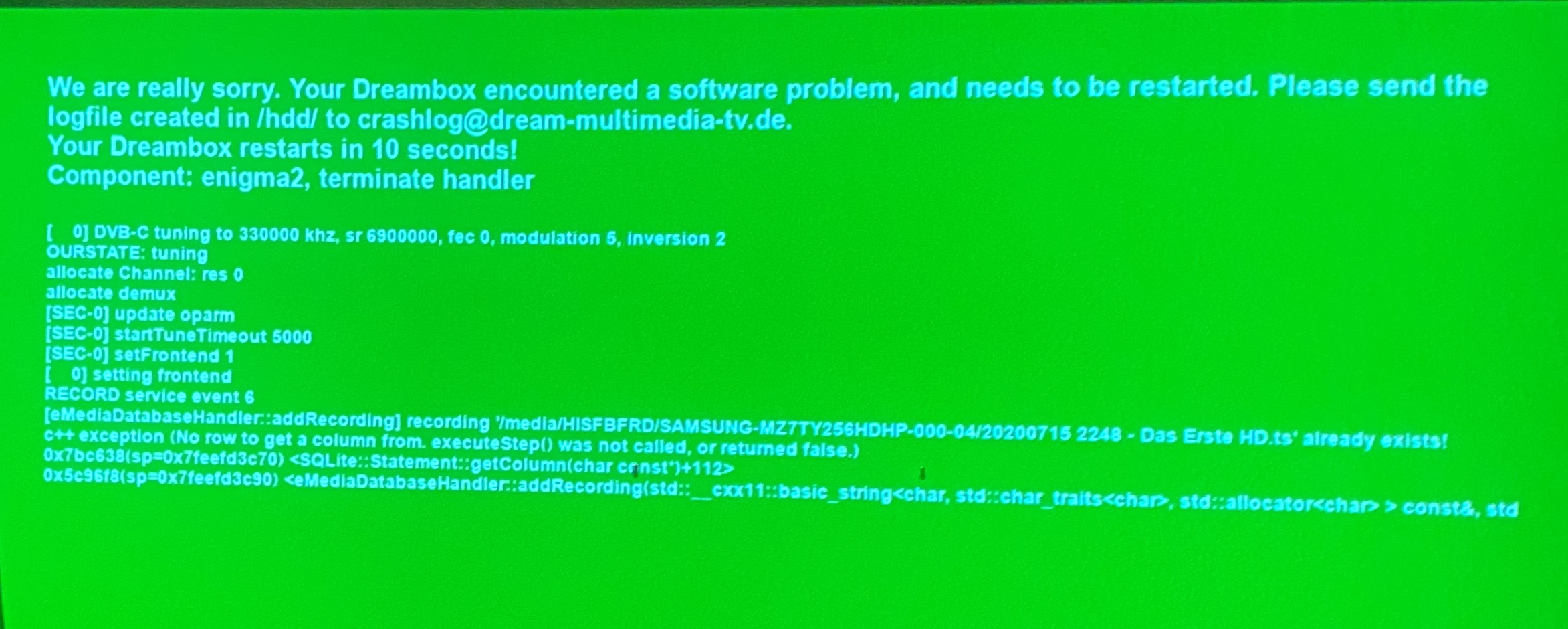 ich habe meine Dreambox mit einem NAS-Laufwerk auf meiner Fritzbox verbunden und wollte dort ein Aufnahmeverzeichnis anlegen. Das scheint auch alles geklappt zu haben, aber als ich die Sache testen wollte, wurde ich plötzlich mit einem grünen Bildschirm konfrontiert, auf dem mir mitgeteilt wird, dass ein Software-Problem aufgetreten sei, weshalb die Box neugestartet werden müsse. Das tut sie dann auch, aber kaum ist sie neu gestartet, verabschiedet sie sich nach ein paar Sekunden mit der gleichen Fehlermeldung wieder. Da hilft nur noch Stromzufuhr kappen. Anbei ein Foto von der Fehlermeldung. Entscheidend ist wohl der Hinweis, "... Das Erste HD.ts already exists". Auf dem NAS-Laufwerk, auf dem ich das Aufnahmeverzeichnis spezifiziert hatte, ist allerdings keine Aufnahmedatei vorhanden.